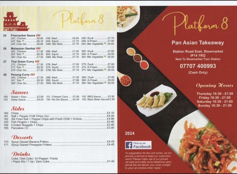 Nestled conveniently next to Stowmarket Train Station, Platform 8 Takeaway stands as the first Asian Fusion takeaway in the area, a delightful addition for those traveling by rail or simply looking to enjoy delicious food. This family business pours its heart into every dish, drawing from a rich blend of culinary traditions across Asia. Bright and welcoming, the takeaway emphasizes cleanliness and a friendly atmosphere that welcomes everyone. Despite its compact size, the space is well-organized and geared toward efficiency, allowing for a quick and pleasant takeaway experience. Open all week, it encourages food lovers to indulge without waiting for the weekend rush. Nearby, the station brings in a variety of visitors, ensuring a diverse clientele ready to sample an innovative fusion of flavors. Parking options are generally adequate, and a quick stop for your meal is always feasible for busy commuters.